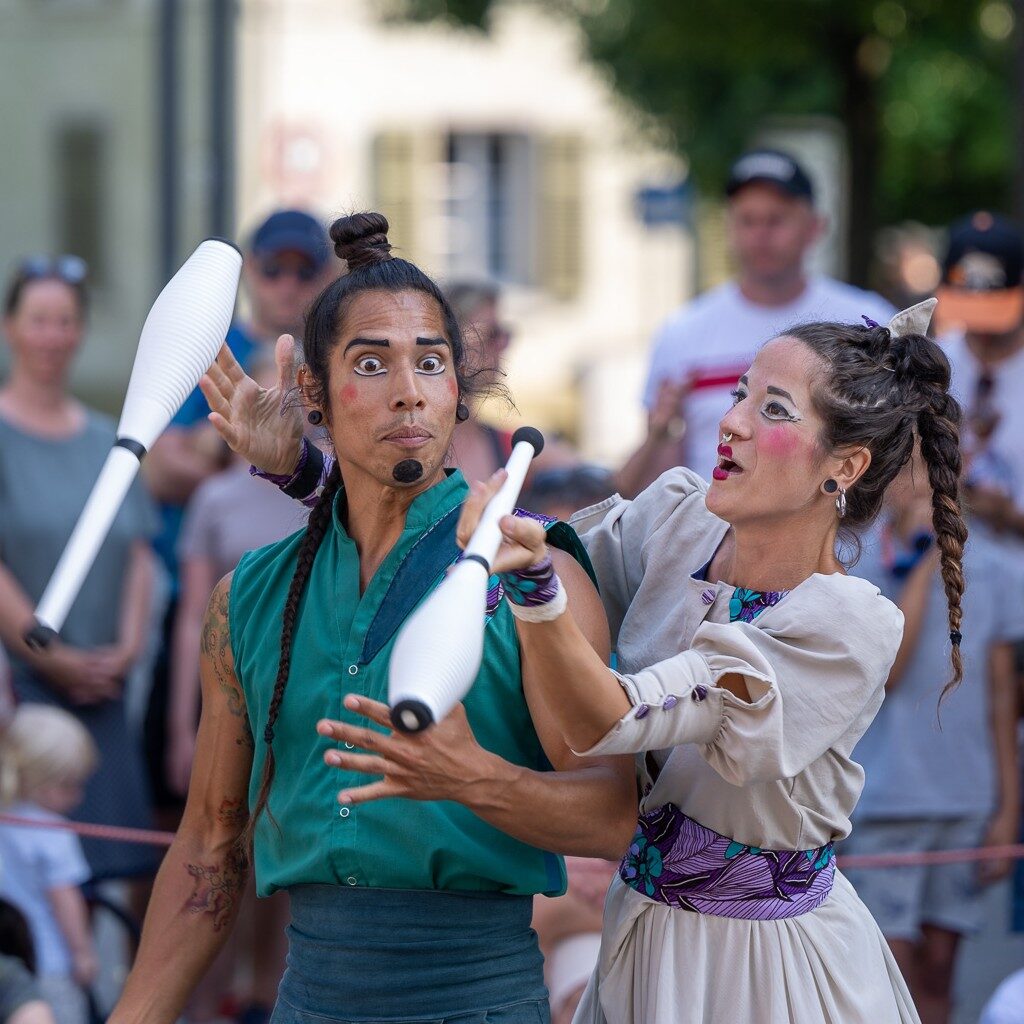 Giocolieri di emozioni, sapranno incantare grandi e bambini con una danza alla ruota Cyr, mantenerli con il fiato sospeso in sorprendenti acrobazie aeree e scatenare incontenibili risate mantenendo un rischioso equilibrio al monociclo.